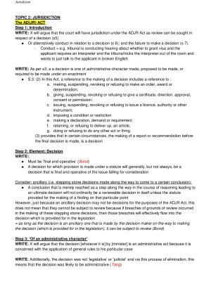 Very structured exam notes (collated from Colin's lectures, readings, tutorials and LSS) 1. Introduction 2. Jurisdiction 3. Standing 4. Reasons 5. Grounds for Judicial Review 6. Procedural Fairness 7. Jurisdictional Error 8. Remedies 9. Privative Clauses 10. Merits Review