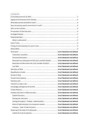 Includes everything that was examinable, ie. week 1 to week 12 content covered in lectures and readings. Covers 1. formal requirements 2. dispensing power 3. secret trusts 4. mutual wills 5. revocation 6. republication of wills 7. intention 8. knowledge and approval 9. undue influence 10. probate and letters of administration 11. disposing of the body 12. collecting deceased's assets. 13. deceased's debts 14. types of gifts 15. text and meaning of a will 16. rules of construction 17. failure of gifts 18. family provision 19 intestacy