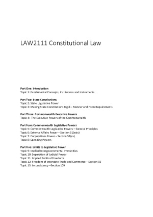 Clean, comprehensive & exam structured course notes for LAW2111 Constitutional Law. Compiled from lectures, textbooks, tutorials, past exams etc. Topics covered: Part One: Introduction Topic 1: Fundamental Concepts, Institutions and Instruments Part Two: State Constitutions Topic 2: State Legislative Power Topic 3: Making State Constitutions Rigid – Manner and Form Requirements Part Three: Commonwealth Executive Powers Topic 4: The Executive Powers of the Commonwealth Part Four: Commonwealth Legislative Powers Topic 5: Commonwealth Legislative Powers – General Principles Topic 6: External Affairs Power – Section 51(xxix) Topic 7: Corporations Power – Section 51(xx) Topic 8: Spending Powers Part Five: Limits to Legislative Power Topic 9: Implied Intergovernmental Immunities Topic 10: Separation of Judicial Power Topic 11: Implied Political Freedoms Topic 12: Freedom of Interstate Trade and Commerce – Section 92 Topic 13: Inconsistency –Section 109