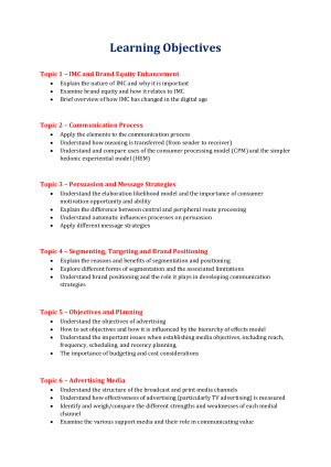 HD Notes, recently completed in trimester 3 2019. 85 overall grade. Organised and comprehensive notes used to achieve HD grades for assignments and exam. Includes: Learning objectives checklist Topic 1 – IMC and Brand Equity Enhancement Topic 2 – Communication Process Topic 3 – Persuasion and Message Strategies Topic 4 – Segmenting, Targeting and Brand Positioning Topic 5 – Objectives and Planning Topic 6 – Advertising Media Topic 7 – Digital Marketing I Topic 8 – Digital Marketing II Topic 9 – Marketing Public Relations and Sponsorship Topic 10 – Direct Marketing, Sales, Promotion & Personal Selling Topic 11 – Evaluating IMC