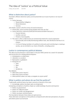 Comprehensive notes for the lectures of Contemporary Political Theory, under clear headings and dot-points. These notes helped me achieve H1s in both my assignments and an overall score of 83. Includes the following topics: - The Idea of 'Justice' as a Political Value - Liberty - Equality - Representation - Political Exclusions in the Private Sphere - Political Exclusion in the Global Order - Duties to the Future - Order - Legitimacy - Revolution