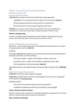 Detailed and comprehensive notes covering topics for the exam. The notes are structured in a way to provide a breif description of each case and the relevant principles taken from it. Topics covered: Consumer Contracts Australian Consumer Law S18 CCA Defective Goods and Services Negligent Advice Agency Partnerships Act Corporations Act On top of this I will include a scan of the double paged notes I took into the exam. The strucuture of this is such that if you can identify the type of question being asked you can follow the steps provided to answer the question.