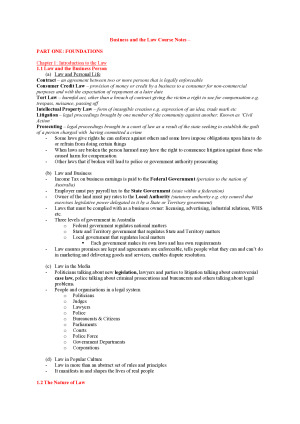 - Notes taken from textbook and lecture slides - Includes case studies in purple Topics Included: 1. Introduction to the Law 2. The Australian Legal System 3. Politicians and Judges 4. How to Find, Understand and Use the Law 5. Deliberately Causing Harm 6. Carelessly Causing Harm 7. Contract Law - Formation of the Contract 8. Contract Law - Terms of the Contract 9. Contract Law Enforcement 10. Dealing with Consumers 11. Dealing with Competitors 12. Property 13. Protecting IP 14. Managing a Business Start-Up 15. Managing a Business: Business Ownership 16. Managing a Business: Companies and Corporate Governance 17. Employment Law – Managing a Business: Employing Workers