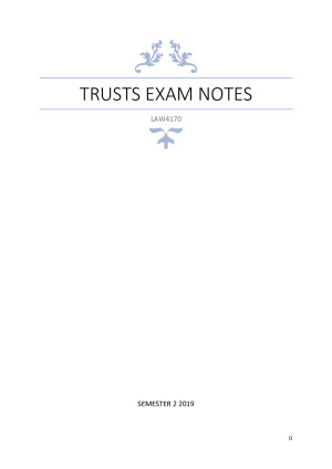 Well formatted, very comprehensive, easy to follow exam notes for LAW4170 Trusts. These notes scored me a 90 for the subject. INCLUDES: all relevant legislation, case summaries and substantive information from all lectures and readings per the semester 2 2019 reading guide. Topics covered (each has relevant sub-topics): *Introduction and classification of trusts *Creation of express trusts *Trust structures *Statutory writing formalities *Constituting the trust *Duties and powers of trustees *Defences and limitations on liability *Rights of trustees *Rights of beneficiaries *Remedies for breach of trust