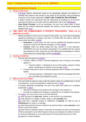 Completed this unit over summer. Achieved a HD (81), these notes were the reason why I was able to achieve such a good grade. went to many consultations with my CE to make sure I understood the content and had it correct in my notes. These notes are in fully structured format and include the entire semesters notes in exam structured format. Topics covered: the family - history and the concept of 'the family'; practising family law - professional and ethical challenges and courts jurisdiction; marriage and divorce - obligations created by marriage; dividing property under the Family Law Act - principles relating to property division between married couples and those living in a de facto relationship; children's rights and parental responsibilities - the Family Law Act relating to parental responsibility and parenting orders; family support spousal maintenance and child support.