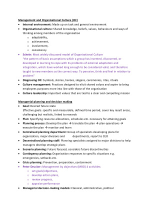 Detailed listed info on each topic Contents: 1. Buzzwords and Quotes 2. Topics - Historical Context - Individual Behaviours in Organisations - Management and Organisational Culture - Management Planning and Decision Making - Management and Organising - Management and Leading - Management and Controlling - Management and CSR - Management and Globalisation 3. Whole Subject Executive Summary ( Pages)