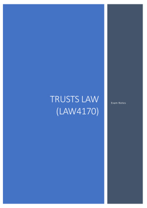 HD Exam notes for Trusts. Easy to use, all ordered in a clear exam answer layout. TOPICS COVERED (ALL): - introduction and classification of trusts - creation of trusts - certainty of subject matter - trust structures - formalities and constitution - duties and powers of trustees - defences and limitation on liability - rights of trustees - rights of beneficiaries - remedies for breach of trust