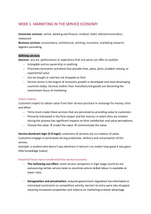 These notes have been compiled from a combination of weekly readings, lecture material and insights brought to life within seminars. With a large volume of content covered in this unit, I have brought together the most important concepts to help with exam study. Content covered includes: Week 1- Marketing in the service economy Week 2- Customer behaviour, culture and service encounters Week 3- Developing service products Week 4- Crafting the service environment Week 5- Understanding costs and developing pricing strategies Week 6- Balancing productive capacity and demand Week 6/7- Integrated services marketing communications Week 7- Managing people for service advantage Week 8- Customer satisfaction and service quality Week 9- Managing relationships and building loyalty Week 10- Handling customer complaints and managing service recovery
