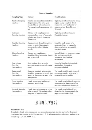 These notes are from a High Distinction Student for FIT1006. It includes notes from all 22 Lectures over 11 weeks. There are detailed examples of the formulas, and how to complete the equations. Topics covered include: - Sampling and Surveying - Descriptive Statistics - Data analysis and reporting - Correlation and regression - Introduction to probability - Probability distributions - Price indexes - Estimation - Hypothesis testing - Time Series Analysis & Forecasting Good luck!