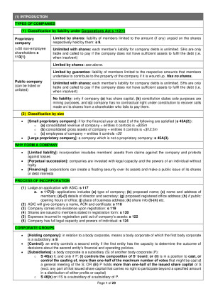 Clear, concise scaffold for LAWS2014 containing step-by-step pointers to answer problem questions in the final exam. This allowed me to achieve an 84 (Distinction) overall. Each topic within the course is developed in a step-by-step manner with clearly-formatted prompts tailored for problem questions. The notes are well-formatted and include: - Key points from each topic - Relevant case citations for each point - Relevant legislation extracts Topics include: 1. Introduction 2. Corporate Personality and Limited liability 3. Corporate Constitution 4. Corporate Organs 5. Binding the Corporation 6. Directors' Duties (Duty to act in good faith, duty to exercise powers for a proper purpose, statutory duties, duty to avoid conflict, duty of care, statutory business judgment rule) 7. Members' Rights and Remedies