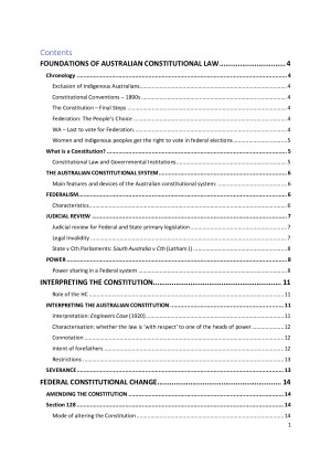 Extensive 56 page notes for exams. These notes are designed to allow you to write your answers whilst following along the notes. The notes provide law and structure for the main issues that come up for each Constitutional power. Includes law-supported notes for all modules such as: - Foundations of Australian Constitutional Law - Interpreting the Constitution - Federal Constitutional change - Trade & Commerce power - Excise duties - External affairs power - Corporations power - Intergovernmental immunity - Inconsistency of laws - Judicial powers Introductory notes for each module is set out and then followed by a table which lists the issues in a step-by-step manner. These notes helped me get 82% in the exam!
