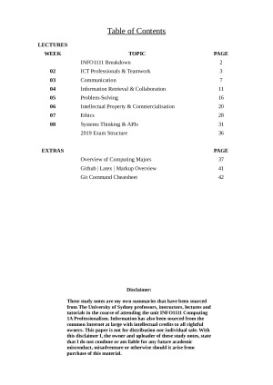 Hi friend, welcome to my notes for INFO1111 Computing 1A Professionalism (Semester 1, 2019). I created these notes as a study guide for the final exam, and scored an HD (88) for the unit. ----- Note Structure: These notes have been condensed from a wide range of sources: all examinable lectures (weeks 2 to 8), tutorial concepts, and additional resources from across the Internet. Due to the heavy content nature of the unit, they have been structured in an easy-to-read bullet point format with anticipated exam questions down the side like embedded flashcards for self-testing (as with every other Psychology student, I realised the best way to study is by testing your retention, not recognition!) ----- Topics included: - INFO1111 Breakdown - ICT Professionals & Teamwork - Communication - Information Retrieval & Collaboration - Problem-Solving - Intellectual Property & Commercialisation - Ethics - Systems Thinking & APIs - 2019 Exam Structure (as outlined by INFO1111 professors in Week 13 tutorial during a preparatory exam review) Extra content: - Overview of Computing Majors - Github | Latex | Markup Overview - Git Command Cheatsheet ----- Hope these help you during your studies. Good luck for your exams! - Ellie