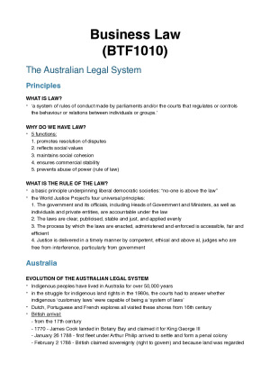 Colour-coded and detailed notes covering all 12 weeks of semester content: - The Australian Legal System - The Law of Contract - Contract Formation (Offer & Acceptance) - The Law of Contract - Contract Formation (other requirements for a Legally Binding Contract) - The Law of Contract - Contents and Interpretation of the Contract - The Law of Contract - Termination and Remedies - Consumer Protection - Consumer Guarantees, Unfair Terms & Unconscionable Conduct - Consumer Protection - Misleading or Deceptive Conduct and False Representations - Specific False or Misleading Representations - The Law of Torts - Liability for Negligent Acts (Physical Harm) - The Law of Torts - Liability for Negligent Statements - Business Organisations - Agency and Partnerships - Business Organisations - Corporations