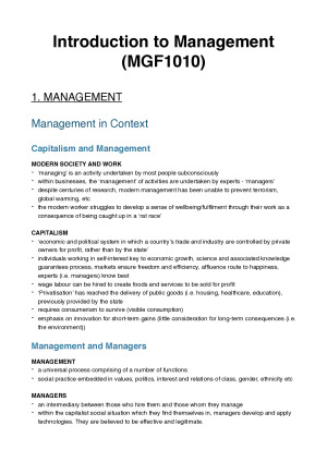 Colour-coded and detailed notes covering all 12 weeks of semester content: - Management in Context - Theories of Management - Managing in and Beyond Corporations - Management in Asia - Planning, Organising, Leading, Controlling (POLC) - Managing Information and Decision-Making - Managing for Inclusion: Equality and Workplace Diversity - Emotional Intelligence - Critical Perspectives on Management and Organisations - The Changing Concept of Career - Employee Well-Being - Employee Voice