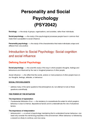 Colour-coded and detailed notes covering all 12 weeks of semester content: - Introduction to Social Psychology: Social cognition and social influence - Social Identity and Social Attribution - Group Dynamics and Intergroup Behaviour - Prejudice, Discrimination, and Prosocial Behaviour - Attitudes and Attitude Change - Attraction and Aggression - Introduction to Personality Theory and Psychodynamic Theory - Self-Concept and Self-Processes - Learning Theories - Trait Theories - Biological Theories - Culture and Personality