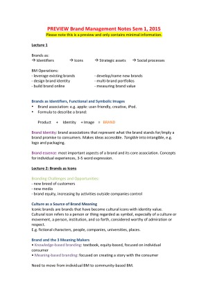 This is my compilation of EVERYTHING Brand Management for MARK3092. I achieved a 90 in this subject using these resources, and by resources I mean every single resource you could need for this course. Including: - Fully summarised course content from lectures, tutorials AND the textbook - Sample exam questions ALL answered - ALL BM articles, resources and KEY READINGS summarised - Case studies and tutorial readings all summarised This is everything you need to ace this course!