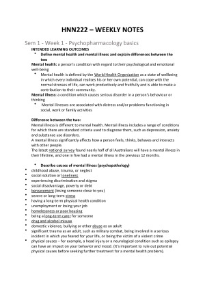Seminars 1-13, Weeks 1-7 Sem 1 - Week 1 - Psychopharmacology basics Sem 2 - Week 1 - Legal and Ethical Issues Sem 3 - Week 2 - mental health assessment Sem 4 - week 2 - Substance Use/Abuse and Dual Diagnosis Sem 5 - week 3 - psychosis and schizophrenia Sem 6 - week 3 - Medical and non-medical approaches to care for people with psychosis and schizophrenia Sem 7 - week 4 - depression Sem 8 - week 4 - bipolar disorder Sem 9 - week 5 - stress and anxiety Sem 10 - week 5 - Stress and Anxiety – medical and non-pharmacological approaches to care Sem 11 - week 6 - personality disorders and self harm Sem 12 - week 6 - eating disorders Seminar 13 - week 7 - Trauma-Informed Practice and Emerging Issues in Mental Health Care