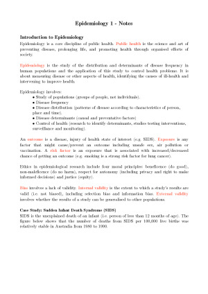 This is a comprehensive compilation of information from POPH90014 lectures, the textbook, tutorials and other useful sources I found online to aid my study. Includes all summarised formulae required to know for each topic. Topics included are: 1. Introduction to epidemiology (role of epidemiology in public health, definitions) 2. Measures of disease frequency (prevalence, incidence proportion, incidence rate) 3. Measures of association (ratios, differences, attributable fractions, prevented fractions, vaccine efficacy) 4. Descriptive epidemiology (age-standardised rates, global health indicators, infant/child mortality) 5. Causal inference (counterfactual definition, exchangeability, confounding, directed acyclic graph; DAGs) 6. Randomised controlled trials 7. Cohort studies 8. Case-control studies 9. Cross-sectional studies (including prevalence surveys) 10. Selection bias, information bias (including differential and non-differential measurement error) 11. Systematic reviews and meta-analyses 12. Assessing the evidence for causality (Bradford-Hill guidelines) 13. Infectious disease epidemiology 14. Screening (specificity, sensitivity, PPV, NPV)