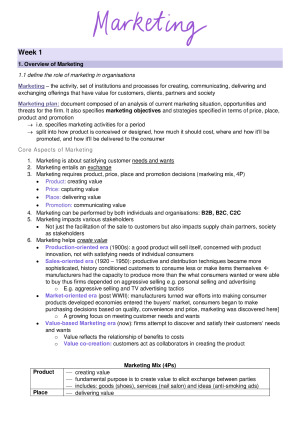 All topics from the trimester syllabus in a concise set of notes with the important information. Incorporates content from the textbook as well as additions of important lecture and tutorial content. Topics Include: - Overview of Marketing - Marketing Ethics, Sustainability and CSR - Analysing the Marketing Environment - Consumer Decision Process - Segmentation, Targeting and Positioning (STP Analysis) - Marketing Research - Product and Branding Decisions - Services: The Intangible Product - Pricing Concepts for Establishing Value - Supply Chain, Channel Management and Retail - Integrated Marketing Communications - Digital Marketing