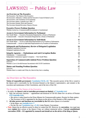 Finding public law boring or difficult? Too many readings? These notes are colour coded to help you navigate the document more easily and pick up the key principles. I have undertaken all the required readings, watched the lectures and combined the notes with problem question discussion in seminars to create an accurate scaffold that allows you to navigate each topic easily in an exam/assignment situation. Although this sample only shows you the qualitative aspects of the course. If you prefer to have information in a structured way, detailing information under each article and case, then you can get these notes. If you would like scaffold/simplified notes, I have another set of notes uploaded under Public Law labelled as ‘Finals Detailed’ which you may be interested in if you're interested in the whole course/detailed notes. Colour Code Legend: - Pink = cases - Bold = important - Blue = principles - Dark blue = legislation ✓ Succinct ✓ Comprehensive ✓ Colour-coded for easy reading Get these notes now and help yourself in law school :) Topics: 1. Executive 2. Access to Government Information 3. Access to Individual Information 4. Delegated Legislation 5. ICAC 6. Ombudsman 7. Judicial Problems