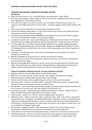 Notes from lectures, class discussions and readings from weeks 1-12. TOPIC LIST: Introduction and Basic Concepts of National Security Legal Structures for the Australian Intelligence Community Constitutional Bases and Issues in National Security Law Overview of Domestic Counter-Terrorism Framework Overview of Special Powers for ASIO and the AFP Use of Force and the Defence Act 1903 Telecommunications and Cyber Security Legislation National Security Legislation and the Litigation Process Pre-Trial Issues in Counter-Terrorism Trials Prosecuting Terrorism Offences Oversight Future Challenges and Directions Next Big Challenges Key Themes