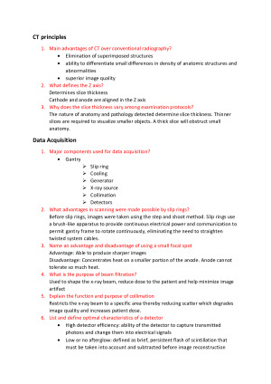 Contains various revision questions which are very useful for the final exam. Topics include: -CT basic principles -Data acquisition -Image reconstruction -Image display -Methods of data acquisition -Image quality -Radiation dosimetry -CT brain -Contrast agents -Injection techniques -CT abdomen and pelvis -CT chest -CT coronary angiography -CT procedures -Paediatric CT -Musculoskeletal procedures