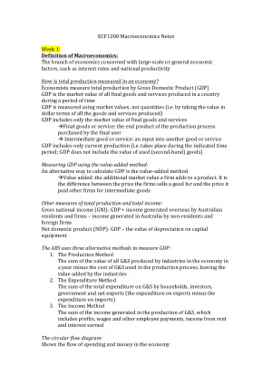 Detailed Macroeconomics notes on every lecture per week of semester, as well as additional research and tips on examinable material. This includes all 12 weeks of topics ranging from Measuring Total Production to International Financial Systems and the GFC. Also Includes theory, diagrams and examples. Topics include measuring total production, income and economic growth, economic growth the financial system and business cycles, long-run economic growth: sources and policies, unemployment, inflation, aggregate expenditure and output in the short run, aggregate demand and aggregate supply analysis, money, banks and the RBA, monetary policy, fiscal policy, macroeconomics in an open economy, international financial system, and the unit special topic of the GFC - an overall holistic understanding of macroeconomics and its purpose within our society.