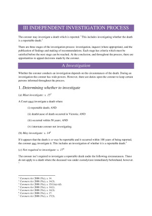 Summaries compiles information from lectures, tutorials, textbooks, commentary, legislation and case law. Thorough and includes sources of all information. Written for the purpose of problem-solving during exams. Topics covered include: 1. Introduction; 2. Coronial Law and the Death Investigation Process; 3. Independent Investigation Process; and 4. Miscellaneous.