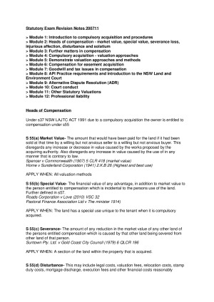 These notes provide great a summary for each module listed below. Overall these notes will prepare one well for the final exam by having an in depth understanding of each module. > Module 1: Introduction to compulsory acquisition and procedures > Module 2: Heads of compensation - market value, special value, severance loss, injurious affection, disturbance and solatium > Module 3: Further matters in compensation > Module 4: Compulsory acquisition - valuation approaches > Module 5: Demonstrate valuation approaches and methods > Module 6: Compensation for easement acquisition > Module 7: Goodwill and tax issues in compensation > Module 8: API Practice requirements and introduction to the NSW Land and Environment Court > Module 9: Alternative Dispute Resolution (ADR) > Module 10: Court conduct > Module 11: Other Statutory Valuations > Module 12: Professional liability