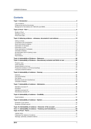 My notes are a compilation of lectures, the required cases, especially with focus on the guidance given by the lecturer. As you can see from the sample, the notes are easy to read, colour-coordinated and is concise, yet covers all you need for the final exam. The notes are well-formatted and structured by topic, including: - Lecturer's focus points are highlighted. - Case summary into Facts/Issue/Held. - Legislation. - Any relevant step-by-step approach to problems questions. Topics include: 1. Introduction 2. Proof - Part 1 3. Adducing Evidence - witnesses, documents & real evidence 4. Admissibility of Evidence - Relevance 5. Admissibility of Evidence - Discretionary exclusion and limits on use 6. Admissibility of Evidence - Hearsay 7. Admissibility of Evidence - Admissions 8. Admissibility of Evidence - Credibility 9. Admissibility of Evidence - Opinion 10. Admissibility of Evidence - Character 11. Admissibility of Evidence - Tendency and coincidence 12. Proof - Part 2