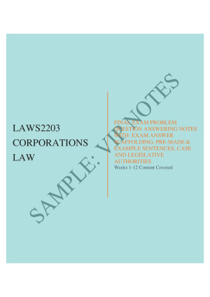 FINAL EXAM PROBLEM QUESTION ANSWERING NOTES: Extensive notes, easy to follow layout with: - EXAM ANSWER SCAFFOLDING, - INTRODUCTORY PARAGRAPHS FOR EACH CRIME, - PRE-MADE & EXAMPLE SENTENCES, - CASE AUTHORITIES - LEGISLATIVE AUTHORITIES (Corporations Act 2001 (Cth)), - DEFINITIONS *Colour Coded for your convenience Content covered from Weeks 1-12 Sourced from lecture notes, readings, textbooks, research. I found it super useful for practicing for exams (and in the actual final exam itself for reference & guidance) as well as answering questions tutorials. Topics Include: - All the Director's Duties: - Statutory - Common Law - Defences - Public vs Proprietary Company - Registration of a Company - Public vs Proprietary Company - Corporate Constitution - Amendment to the Constitution - Replaceable Rules - Common Law Restrictions on altering the constitution. - Corporate Contracts - Pre-registration contracts - Indoor Management Rule - Corporate Decision Making - Classes of Shares - Procedure for variation of class rights - Challenging a class variation - Corporate Finance - Dividend Payment - Remedies - Criminal and Civil Penalties - Relief - Winding Up - Voluntary Administration - Insolvent Trading - Case (common law) Authorities - Corporations Act Legislative Authorities