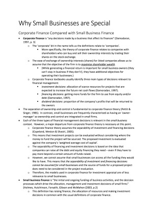 These notes are a comprehensive summary of AFM322 compiled from lectures, lecture notes, and textbook readings. I received an Distinction in this unit, so these notes are very high quality. They simplify complicated ideas, while explaining them succinctly. They will be beneficial to any student undertaking this unit, as it is a very theoretical unit with lots of new concepts not touched upon in other business school subjects. The topics covered in these notes are: Topic 1 - Why Small Businesses are Special Topic 2 - Economic Theory & Small Firms Topic 3 - Legal Structures, Ownership, and Exit Pathways Topic 4 - Agency & Signalling Theory Perspectives Topic 5 - Access to Equity Finance Topic 6 - Access to Debt Finance Topic 7 - Capital Structure Topic 8 - Small Firm Growth Topic 9 - Success & Failure in Small Firms Topic 10 - Small Firm Valuations