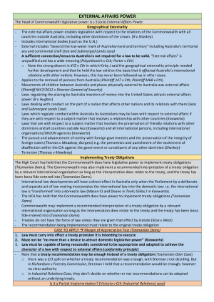 I ALSO SELL FULL NOTES: Quick Scaffolds I used in my final exam. I received a high distinction in the exam. Covers: - External Affairs Power - Corporations - Freedom of Interstate Trade - Taxation - Grants - Defence Power - Implied Freedom of Political Communication - Guide to answering questions