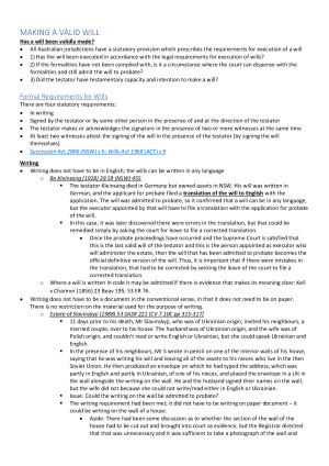 Very detailed notes of the entire course. NOT to be used as an exam summary. Received 90+ on the final exam and overall Includes the topics: What is Succession Law? Formal Requirements for Wills and Dispensing with Formalities Testamentary Dispositions Outside the Will Revocation and Alteration of Wills Testamentary Capacity and Intention to Make a Will Probate and Letters of Administration Executors and Administration The Text and Meaning of a Will Failure of Gifts Family Provision Intestacy