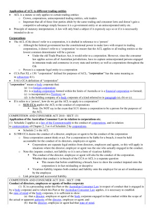 Very detailed notes of the entire course. NOT to be used as an exam summary. Received 90+ on the final exam and overall Topics include: Foundations: Application of ACL Conduct “in trade or commerce” Misleading & Deceptive Conduct - Evaluating “the class of consumers”; Evaluating “misleading or deceptive” Unconscionable conduct Unfair Contract Terms Regime Unsolicited consumer agreements Consumer guarantees regime Manufacturers liability for defective goods Consumer Remedies