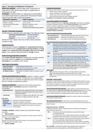 These notes contain a summary of all topics for ACFI2012, including: - Topic 1: The nature and regulation of companies - Topic 2: Accounting for intangibles - Topic 3: Accounting for company income tax - Topic 4: Financing company operations - Topic 5: business combinations and consolidation - Topic 6: consolidation - wholly owned entities - Topic 7: consolidation - intragroup transactions - Topic 8: consolidation - non-controlling interest - Topic 9: accounting for equity investments - Topic 10: accounting for financial instruments - Topic 11: accounting for foreign currency transactions
