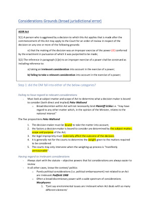 I got an HD using these scaffolds - just the case principles extracted under all the main points. Easy to follow step by step process - you can't go wrong! These are basically all you need for the exam! Please see my long notes sold seperately for full explanations. OUTLINE/TABLE OF CONTENTS - Problem Question Outline: Judicial Review 4 Threshold Issues 4 Does the court have jurisdiction? 4 Step 1. Commonwealth or State? 5 State 5 Commonwealth 6 Step 2: is it a decision/conduct? 6 Step 3: is it of administrative character/under an enactment? (if not, say Q a regulation, go to JA) 7 Judiciary Act 1903 (Cth) S39B Original Jurisdiction of Federal Court: 8 Step 4 (or 2): is it a public of private decision? (all courts) 8 Does the Applicant have Standing? 9 Common Law Test: Sufficient Interest (ACF) 9 Statutory Test: Person aggrieved 9 Grounds of Review 10 Is the regulation within the power conferred by the Act? (Judicial Errors of Lawmakers - Judicial Review of Rule-Making/Delegated legislation) 10 Delegated Legislation/regulations 10 Means/End Distinction 11 Narrow Judicial Errors of Decision-Makers (Errors of Law & Fact) 11 Q 1: was there an error in interpreting or applying the statute? 11 The fact/law distinction 11 Q 2: No evidence? 11 Q 3: Is an ‘Objective Jurisdictional Fact’ missing? 12 Q 4: or is it a subjective jurisdictional fact/opinion? 12 was the fact finding illogical or irrational? 12 Procedural Fairness (broad jurisdictional error) 13 Step 1: is procedural fairness implied? 13 Common Law General Rule Kioa 13 Does an exception apply? 13 Advisory Reports and Recommendations 14 Urgency 14 Step 2: Content of the hearing rule (checklist below) 14 Notice: disclosure of adverse information and critical issues 14 Confidential information / national security? 14 Disclosure of adverse conclusions 14 Fair Hearings 14 Witness and Cross Examination 15 Responding to arguments 15 Fraudulent actions of third party 15 The Rule Against Bias 15 2 step test 15 Main categories of bias 15 Step 1: Identify type of Bias 15 Actual bias / prejudgment 15 Extraneous Information 16 Step 2: Logical connection between apprehended bias and decision 16 Multi Member Committees 16 Step 3: Exceptions 16 Common Law principle of Statutory Exclusion & Necessity 16 Waiver & Recusal 16 Considerations Grounds (broad jurisdictional error) 17 Step 1: did the DM fall into either of the below categories? 17 Failing to have regard to relevant considerations 17 Having regard to irrelevant considerations 17 Step 2: did DM partake in an “active intellectual engagement” with requisite considerations 18 Step 3: Or did DM take into account an improper or Unauthorised Purpose 18 Policies (Jurisdictional Error) 18 Representations & Estoppel 19 Acting under dictation (jurisdictional error) 19 Statutory directions 20 Unauthorised Delegations 20 Does Administrative Necessity Apply? 20 Questioning the Caltona Principle 21 Unreasonableness (broad jurisdictional error) 21 Threshold 22 Inconsistency of treatment 22 Oppressive treatment 22 Statistical Problems 22 Failure to make inquiries 22 Uncertainty (jurisdictional error) 22 Jurisdictional Error Overview + Breach of Statutory Requirements (when it may or may not result in jurisdictional error) 23 Step 1: What is necessary to establish a jurisdictional error? 23 Step 2: did the legal error materially affect the outcome of the case? 24 Step 3: what will be the legal status of the decision? Invalid or unlawful? 24 Remedies (if any) to be granted 24 The Prerogative Writs (Common Law) 24 Remedy 1: Certiorari 24 Certiorari: error of law on the face of the record 25 Remedy 2: Prohibition 25 Remedy 3: Mandamus 26 Remedy 4: Injunctions 26 Equitable remedy: Declarations 26 Constitutional writs 26 ADJR Remedies 27 ADJR: Federal Court discretion to grant remedy 27 Severance 28 Breach of Statutory Duty to Give Reasons 28 Statutory Attempts to Exclude and Restrict Judicial Review (Privative Clauses – Exception?) 29 Step 1: Does the clause exclude jurisdiction to review decision? 29 Commonwealth 29 State 29 Step 2: does a clause exclude ability to invalidate decision? 29 Step 3: is the clause constitutionally invalid because it impairs the entrenched minimum provision for judicial review? 30 Examples 30 Merits Review 30 Step 1: is it a q of law? 30 Administrative Appeal Tribunal 30 Step 1: Does the AAT have jurisdiction? 30 Step 2: Does the applicant have standing? 30 Step 3: Did the appellant request reasons for their decision? 31 Step 4: what occurs at hearings before the tribunal? 32 Step 5: What decision-making powers does the AAT have? 32 Step 6: Unhappy with AAT? appeal decision to the Federal Court 33 Common Law Rules of AAT 33