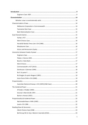 Long notes with complete case summaries and explanation of heads of power, limitations etc. See step by step exam scaffolds with just the major principles extracted sold seperately TABLE OF CONTENTS Introduction 9 Engineers Case 1920 9 Characterisation 14 Whether a law is constitutionally valid 14 Characterisation of laws 14 Melbourne Corporation v Commonwealth 14 Tasmanian Dam Case 15 Bank Nationalisation Case 15 Dual Characterisation 15 Fairfax v FCT 16 Work Choices Case 16 Herald & Weekly Times Ltd v Cth (1966) 16 Murphyores Case 16 Actors and Announcers Equity 17 Interaction between heads of power 17 Engineers Case 17 Pidoto v Victoria 1943 17 Bourke v State Bank 17 Work Choices 17 Commonwealth v ACT (2013) 18 Stenhouse v Coleman (1944) 18 Re F; Ex parte F 19 Re Dingjan; Ex parte Wagner (1995) 19 Grain Pool of WA v Cth (2000) 19 Proportionality 20 Australian National Airways v Cth (1945) (ANA Case) 20 The Incidental Power 21 D’Emden v Pedder (1904) 21 Grannal v Marrickville 1955 21 Burton v Honan (1952) 21 Proportionality & Incidental Power 22 Nationwide News v Wills (1992) 22 Leask v Cth 1996 22 Reading Down & Severance 23 (Work Choices Case) 2006 23 Bell Group NV (in liq) v Western Australia (2016) 23 Victoria v Commonwealth 1996 24 Trade & Commerce Power 24 W&A McArthur v QLD (1920) 25 ANA Case 1945 25 AG (WA) v Australian National Airlines Commission (1976) 26 R v Burgess; Ex parte Henry (1936) 26 Effect of the incidental power 27 Wragg v NSW (1953) 27 Second Airlines Case (1965) 27 O’Sullivan v Noarlunga Meat Ltd (1954) 28 A-G (WA) v ANA Commission (1976) (Sweeney) 29 Pape v Commissioner of Taxation (2009) 29 Inconsistency 30 Direct inconsistency – Impossibility of obedience test 31 Direct inconsistency – Denial of rights test 32 Clyde Engineering Co Ltd v Cowburn (1926) 32 The Kakariki 33 Telstra Corporation Ltd v Worthing 1997 33 Outback Ballooning Pty Ltd (2019) 33 R v Brisbane Licensing Court; Ex parte Daniell (1920) 34 Ex Parte McLean 1930 35 Commercial Radio Coffs Harbour v Fuller (1986) 35 Ansett v Wardley (1980) 35 Operational Inconsistency 36 Cth v WA 1999 36 Momcilovic v The Queen (2011) 36 Commonwealth v ACT (2013) 37 Manufacturing Inconsistency 37 West v Comm of Taxation (NSW) 38 Wenn v A-G (Vic) (1948) 38 Airlines of NSW Pty Ltd v NSW (no 2) (Second Airlines Case) 1965 38 Botany Municipal Council v Federation Airports Corporation (1992) 39 Bayside City Council v Telstra Corporation Ltd 2004 39 Work Choices Case (2006 39 R v Credit Tribunal; Ex parte General Motors Acceptance Corp (1977) 40 Viskauskis v Niland 1983 40 University of Wollongong v Metwally (1984) 40 External Affairs Power 41 Geographical externality: matters external to Australia 41 R v Sharkey (1949) 41 Seas and Submerged Lands Case (1975) (NSW v Cth 1975) 42 Polyukhovich Commonwealth (1991) 42 Horta v Commonwealth (1994) 42 Pape 2009 43 Thomas v Mowbray (2007) 43 Alqudsi v Commonwealth (2015) 44 Treaties 44 R v Burgess; Ex parte Henry (1936) 45 Tasmanian Dam Case 45 Limits to the power to implement treaties 46 Tasmanian Dam Case 46 Richardson v Forestry Commission 1988 46 Victoria v Commonwealth (Industrial Relations Case) 1996 47 Defence Power & Nationhood Power 47 Overview of the Constitutional provisions re defence 47 Nature of the defence power – waxing and waning 48 Andrews v Howell 1941 48 It is a Purposive power 48 Stenhouse v Coleman (1944) 49 War and its aftermath 49 R v Foster (1949) 49 Communist Party Case (1951) 49 The Commonwealth cannot recite itself into power 49 Defence Power’s Primary/Secondary Aspect: Fullager J 49 The stream cannot rise higher than its source (Fullager J) 50 Validity of law does not depend upon the opinion of a decision-maker 50 The need to establish a state of war 50 Marcus Clark & Co v Commonwealth (1952) 51 Anti Terrorism 51 Thomas v Mowbray (2007) 51 Nationhood Power 52 Davis v Commonwealth (1988) 52 Pape v Commissioner of Taxation 53 Corporations Power 54 What is a corporation? 54 Communications Union v Queensland Rail (2015) 54 What is a foreign, trading or financial corporation? 55 What degree of trading is required to make a ‘trading corporation’? 55 R v Trade Practices Tribunal; Ex parte St George County Council) (1974) 55 Adamson’s case (1979) 56 Financial Corporations 56 State Superannuation Board v Trade Practices Commission (1982) 56 Corporations that have no activities 57 Fencott v Muller (1983) 57 Can a government body be a trading corporation? 57 Tasmanian Dam Case (1983) 57 Lower courts and a more liberal test 57 Early view of the corporations power 58 Huddart Parker & Co Pty Ltd v Moorehead (1908) 58 Strickland v Rocla Concrete Pipes Ltd (1971) 58 Scope of the corporations power 59 Fontana Films (1982) 59 Tasmanian Dam Case 59 Re Dingjan; Ex parte Wagner (1995) 60 Work Choices Case 2006 60 Williams v Commonwealth (no2) 61 The Power to Incorporate 62 Incorporation Case 1990 62 Return to co-operation 62 Race Power 63 Koowarta v Bjelke-Petersen (1982) 63 Tasmanian Dam Case 64 WA v Commonwealth (1995) 64 Kartinyeri v Commonwealth (1998) 65 Expert panel recommendation 67 Grants Power & Appropriations 68 Section 96 Grants Power 69 Cth not to have ‘favourites’: s51(ii) combined with s99 70 Victoria v Cth (Federal Roads Case) (1926) 70 Deputy Commissioner of Taxation (NSW) v WR Moran Pty Ltd (1939) 70 W R Moran v Deputy Federal Commissioner of Taxation (NSW) 1940 71 First Uniform Tax Case (1942) 71 Second Uniform Tax Case (1957) 72 DOGS Case (1981) 72 P J Magennis Pty Ltd v Commonwealth (1949) 73 Pye v Renshaw (1951) 73 ICM Agriculture Pty Ltd v Commonwealth (2009) 73 Williams No 1 on s96 74 Appropriations powers 74 Appropriations for the ordinary annual services of government 74 Pape v Commissioner of Taxation (2009) 75 Williams v Commonwealth No 1 (2012) 76 Williams v Commonwealth No 2 77 Wilkie v Commonwealth (2017) 77 Taxation Power 78 Section 51(ii) 78 Section 114 79 Section 53 79 Section 55 80 Justiciability and practice 80 Defi