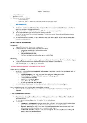 I achieved HDs for my ADR assignment and exam using these notes. They comprise a comprehensive yet concise incorporation of ALL readings, including: - The textbook - Cases - Study guides - Lecture materials They are very thorough and easy to read so you won't need to read the textbook, cases or study guides, which will save a lot of time. They include the following topics: 1. Introduction to ADR 2. ADR in Australia 3. Negotiation 4. Mediation 5. Arbitration 6. Family Dispute Resolution 7. Criminal Restorative Justice Programs 8. Australian Financial Complaints Authority 9. ADR in Health Care 10. Confidentiality in ADR Processes