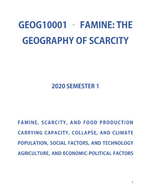 GEOG10001 Famine: the Geography of Scarcity complete notes (very comprehensive) + summary table (also comprehensive) at the end! divided into important points and topics for ease of revision - summary table is very useful for looking things up quickly and is even sufficient for revision what's included: - complete index of contents - lecture notes (not just slide content) - notes from further readings - summary of the whole subject compressed into a table topics covered: - famine, scarcity, and food production (lectures 1, 2, 3) - carrying capacity, collapse, and climate (lectures 4, 5, 7) - population, social factors, technology (lectures 6, 8, 9, 10) - agriculture, and economic and political factors (lectures 10, 11, 12 + guest lecture-case study)