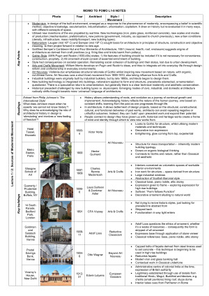 These clear and concise summary tables cover Lectures 1-8, making it a very helpful resource for the Mid-Semester Test, as well as parts of the final exam. Comprised in the form of 5 A3 poster pages, they include: - Key points from Lectures (exploring major themes, movements, events of the time). The lectures covered are: - L1: Sources of Modernist Movement - L2: Sources of Modernist Movement - L3: Frank Lloyd Wright - L4: German Architecture - L5: Futurism and Modernism in Italy - L6: Dutch Opposites - L7: Dilemma of Soviet Architecture - L8: Le Corbusier - Key Buildings to be on the in-class test, and final exam (name, photo, year, architect, style/movement, descriptions) - Key points from Readings (main ideas, post-edited from tutorial discussions) They are a product of watching each lecture at least 2 – 3 times, as well as detailed evaluation from readings, and other research materials. They helped me score 95% for the in-class test, and I hope they can be of value and assistance to you too!