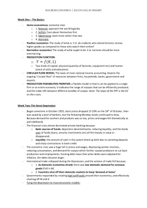 These notes provide an in-depth summary of all formulas, economic history and theories covered in the Macroeconomics 1 course at the ANU. TOPICS COVERED: Week One: The Basics Week Two: The Great Depression Week Three: National Income Accounting Week Four: Economic Growth Week Five: Labour and Unemployment Week Six: Inflation Week Seven: Aggregate Expenditure Analysis Week Eight: AD-AS Models Week Nine: Schools of macroeconomic thought Week Ten: Monetary Policy Week Eleven: Fiscal Policy and Government Budget Constraints Week Twelve: Open Economy Macroeconomics