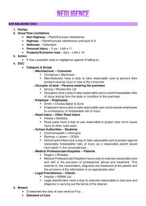 Topics Covered: Weeks 4-12 - Negligence (all elements), Breach of Statutory Duty, and Workers Compensation. These notes are what I used for my final exam, which resulted in me getting good marks. These notes are very detailed and great for tutorial work, general notes and revision!