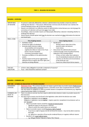 Our exam only covered topics 5 onwards: - T5 'Reasons for decisions' and FOI - T6 'Acting outside of power (grounds for judicial review 1)' including: ultra vires, absence of power, abuse of power or discretion, fact finding errors, failure to exercise discretion/power. - T7 'Procedural fairness (grounds for judicial review 2)' including: hearing rule (CL), bias rule (CL) - T8 'Jurisdictional Error' - T9 'Remedies' - T10 'Privative Clauses'