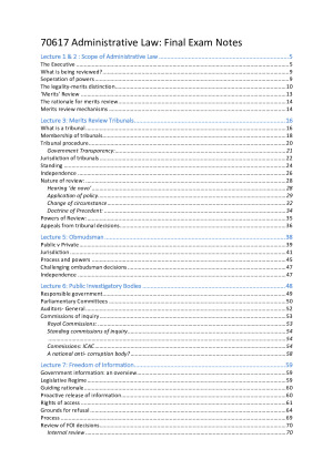 Comprehensive, colour coded final exam notes with condensed summaries of major judgements from cases. Covering all topics: - Scope of Administrative Law - Merits Review Tribunals - Ombudsman - Public Investigatory Bodies - Freedom of Information - Privacy - Delegated Legislation - Judicial Review - Remedies - Errors of Law - Grounds of Review/ Grounds of Jurisdiction - Restricting Judicial Review