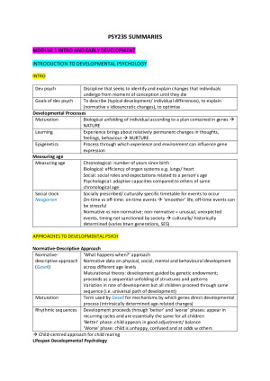 High quality summary notes covering all examinable lecture topics Topics covered: (1) Introduction to Developmental Psychology (2) Prenatal Development, Genes, Environment, (3) Physical and Perceptual Development, (4) Cognitive Development A, (5) Cognitive Development B, (6) Emotional Development and Attachment, (7) Temperament, (8) Contexts: Parenting, Siblings, Families, (9) Gender Development, (10) Moral Development, (11) Adolescence/ Adult Development, (12) Adult Development Continued, (13) Death and Dying,