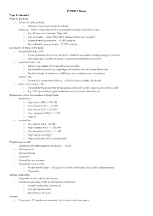 Entire 12 weeks' worth of notes compiled from lectures, tutorials, prescribed textbook and further research on the following topics: - Topic 1: Foundations - the cell membrane and cellular transport mechanisms - Topic 2: Communication systems - electrical signalling in the body - Topic 3: Communication systems - chemical signalling in the body - Topic 4: Input systems - sensory systems and processing of sensory information - Topic 5: Output systems - muscular control of body movements, autonomic and endocrine response systems I received a HD in this subject using these notes and hopefully you can too!