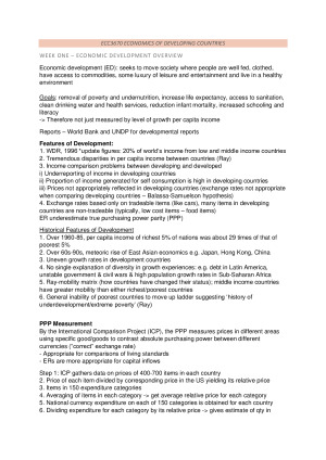 Hi! These are very comprehensive and detailed notes taken from lectures, several textbooks, required readings, other online sources and empirical studies. This unit requires a lot of reading, understanding of theories and keeping up to date with latest data. I've tried to compile most of that into my notes and it's definitely helped me achieve a high grade this semester. These notes are definitely a great supplementary guide in addition to the lectures and tutorial exercises which I hope will improve your understanding of these topics! Topic list - 1. Overview of Economic Development 2. Growth Models and Development 3. Dual Economy Models and Rural Urban Migration 4. Wage Rigidity: The Efficiency Wage Hypothesis 5. Measurement of Economic Inequality 6. Poverty and Undernutrition 7. Malnutrition and Health 8. Gender Bias, Women's Empowerment and Missing Women 9. Measures of Inequality and MDGs and SDGs 10. Development and Climate Change