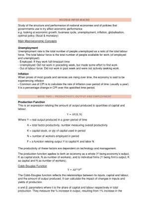 Hello! These are very comprehensive notes covering each topic as part of the unit guide (completed in Sem 1 2020). Information in these notes contain content from lectures AND the textbook so they are very detailed! There are many diagrams and graphs which will assist your learning and the theory behind these concepts. These notes are definitely a great supplementary guide to lectures and tutorial exercises which will definitely improve your understanding of macro. Topics: 1. Introduction to Macroeconomics 2. Productivity, Output and Employment 3. Consumption, Savings and Investment 4. Investment and Goods Market Equilibrium 5. Open Economy Savings and Investment 6. Long-Run Economic Growth 7. Asset Market, Money and Prices 8. IS-LM + AD-AS Model 9. Classical Business Cycle Analysis 10. Keynesian Model