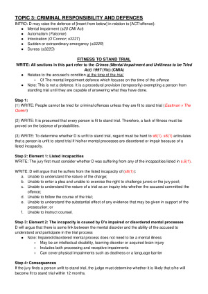 Very structured crim 2 notes (summarising all important information from lectures, readings, tutorials and LSS) Structured in a checklist manner that will allow all the relevant issues to be easily identified. Includes pre-formulated sentence structures to allow for an efficient answer in an exam (whilst maximising marks). Topic 1: Introduction/review of principles Topic 2: Criminal procedure Topic 3: Criminal responsibility and defences Topic 4: Strict and absolute liability Topic 5: Drug offences Topic 6: Property offences Topic 7: Attempts Topic 8: Complicity Topic 9: Corporate criminal liability